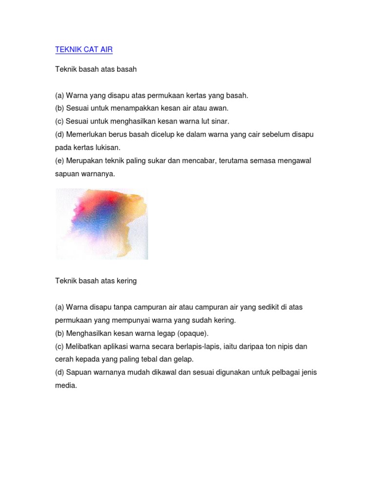 TEKNIK CAT AIRBASAH ATAS BASAHTeknik ini dilakukan dengan memasukkan warna lain di atas warna yang sedia ada semasa basahIni bertujuan supaya warna kedua da. Antaranya ialah catan. Cat minyak cat air dan pensel warna.